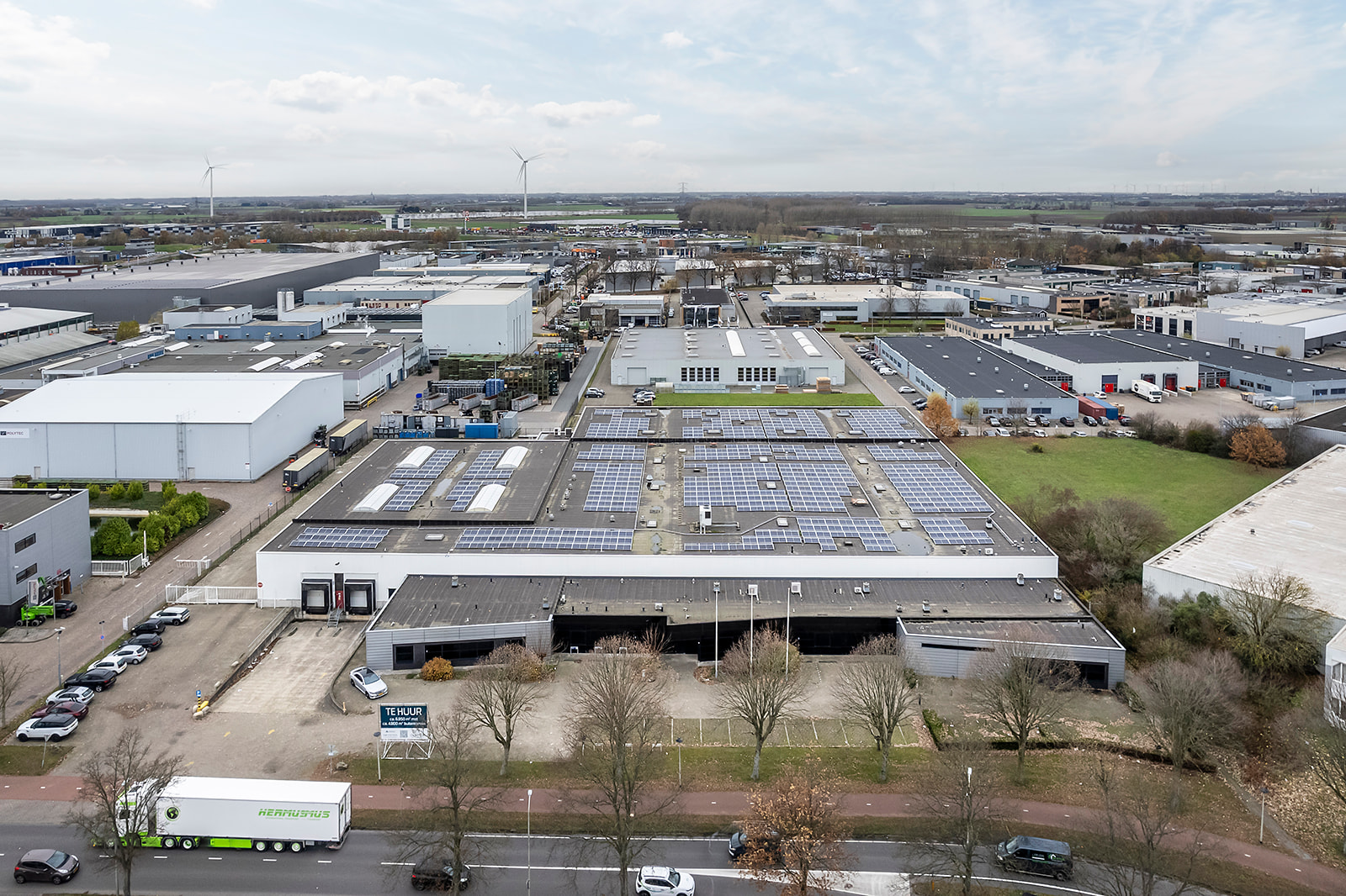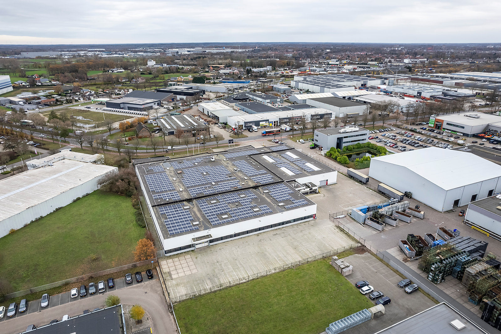 3 overheaddeuren op maaivelddak voorzien van 1.442 zonnepanelen, geschatte jaaropbrengst ca. 490.000 kWh