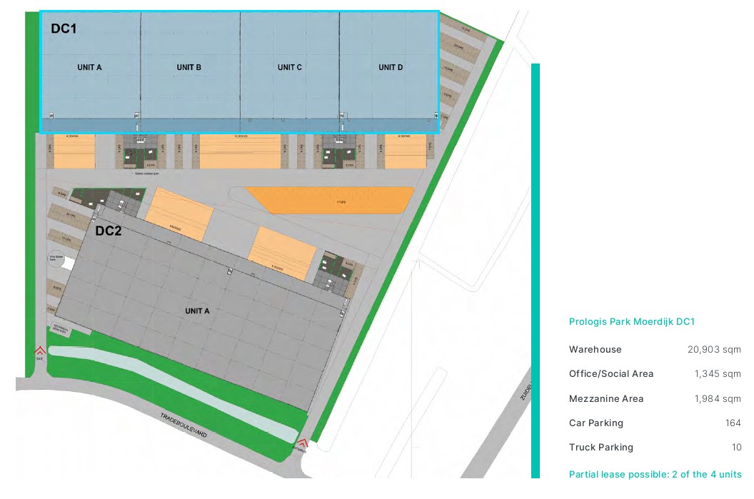 Dit betreffende warehouse DC1 heeft een oppervlakte van circa 21.000 m² en kan zowel in zijn geheel als in twee delen vanaf circa 10.500 m² worden gehuurd.
